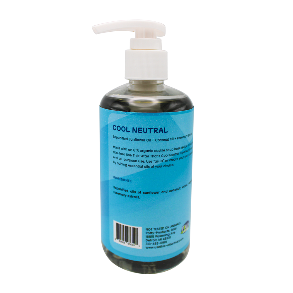 Made with an 81% organic castile soap base recipe for superior lather and skin-feel. “Use This-After That’s” – Cool Neutral is perfect for skin, hair or general all purpose use. Use “as-is” or create your own scented castile soap by adding essential oils of your choice.